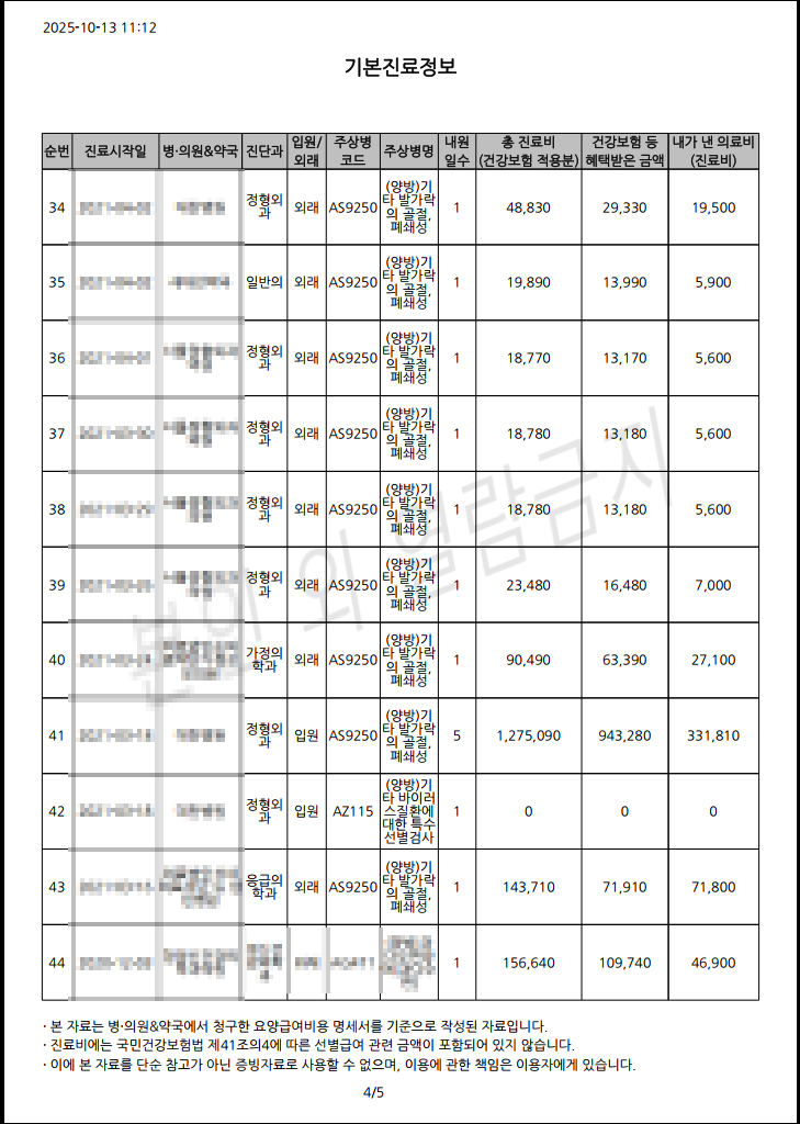 ▶ 해당 서류에서 치료 내용 수술(시술)은 확인이 되지 않는다. 세부진료정보에서는 가능한 경우가 있다.