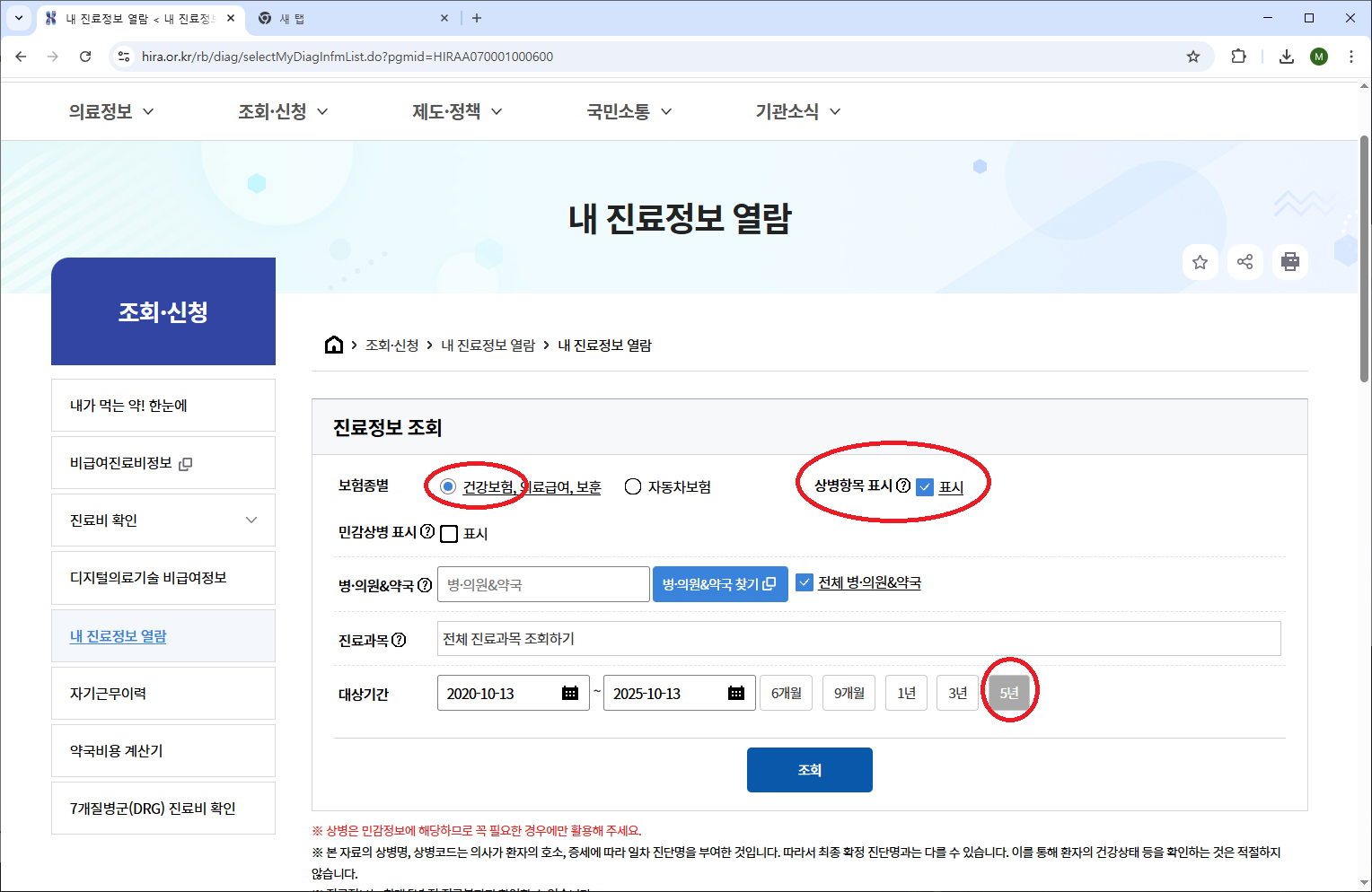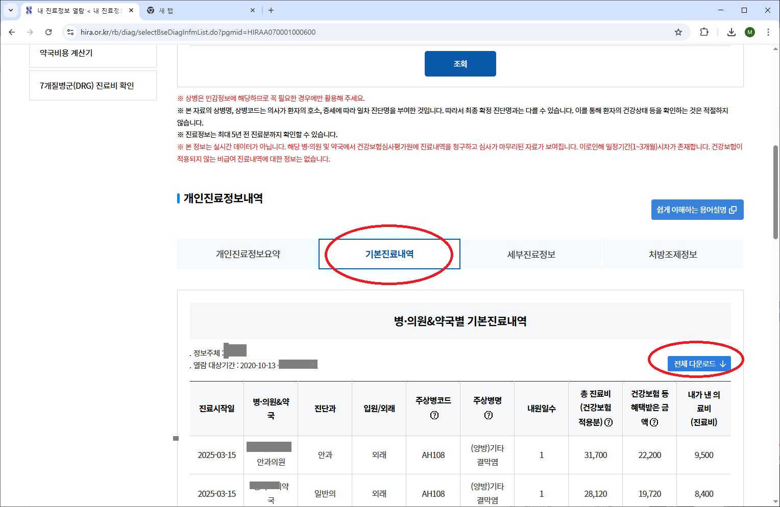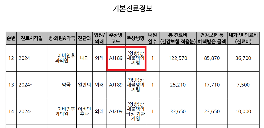 개인진료정보내역 - 기본진료내역을 보면