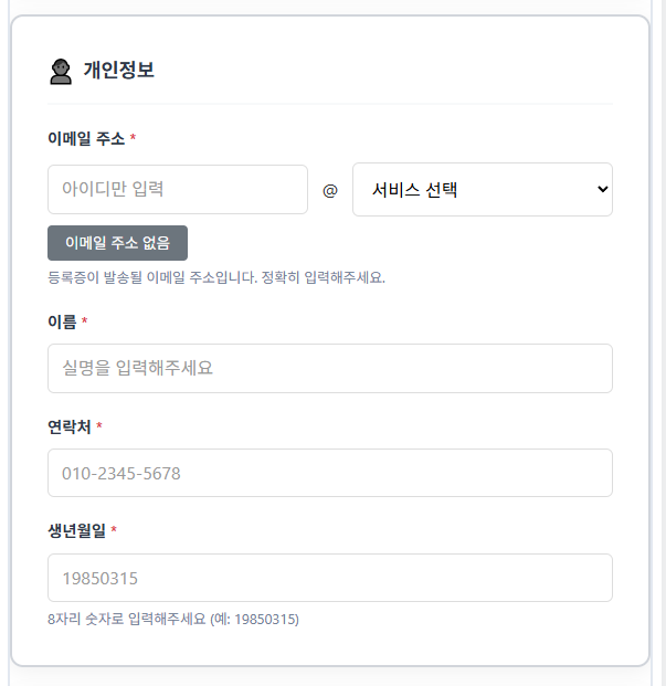 이메일주소, 이름, 연락처, 생년월일을 입력해주세요.