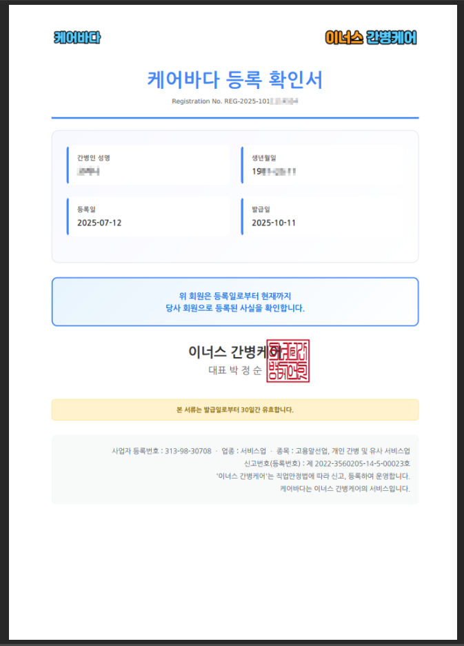 간병인 등록증을 작성하신 분을 입력해주시고,