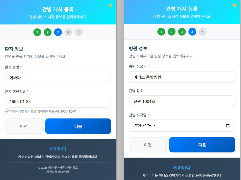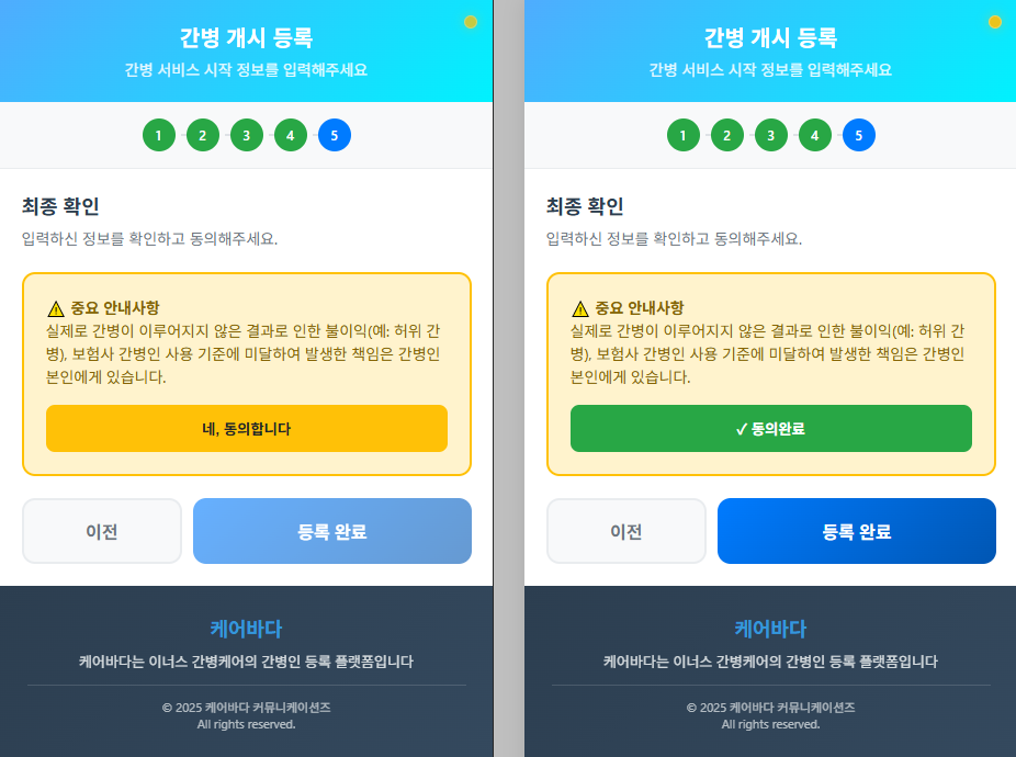 ⚠️ "어제부터 간병했는데 시작 날짜 변경해주세요"라는 요청은 불가능합니다. 모든 기록은 시스템에 저장되며 임의 수정이 불가합니다.