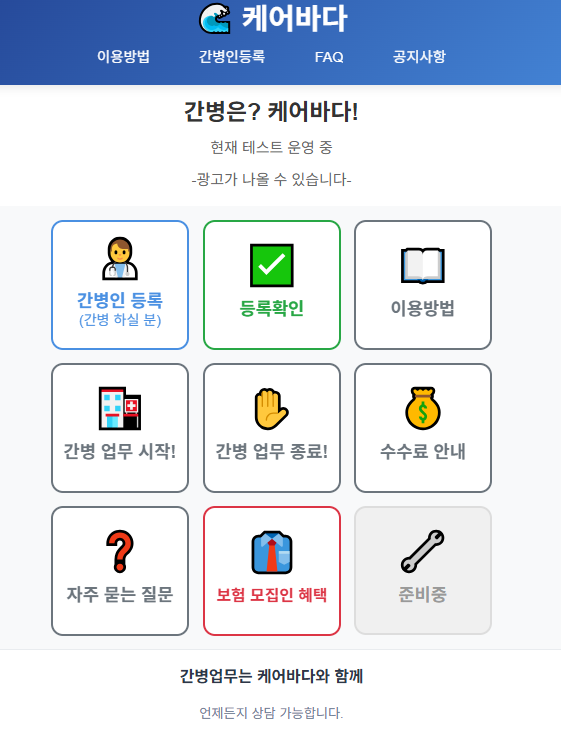 케어바다 홈페이지 초기화면에서 '간병 업무 시작!' 버튼을 눌러주세요. (화면 좌측 중앙에 있습니다)