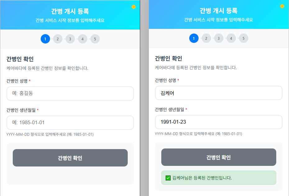 등록하신 간병인의 성명과 생년월일을 입력해주세요.