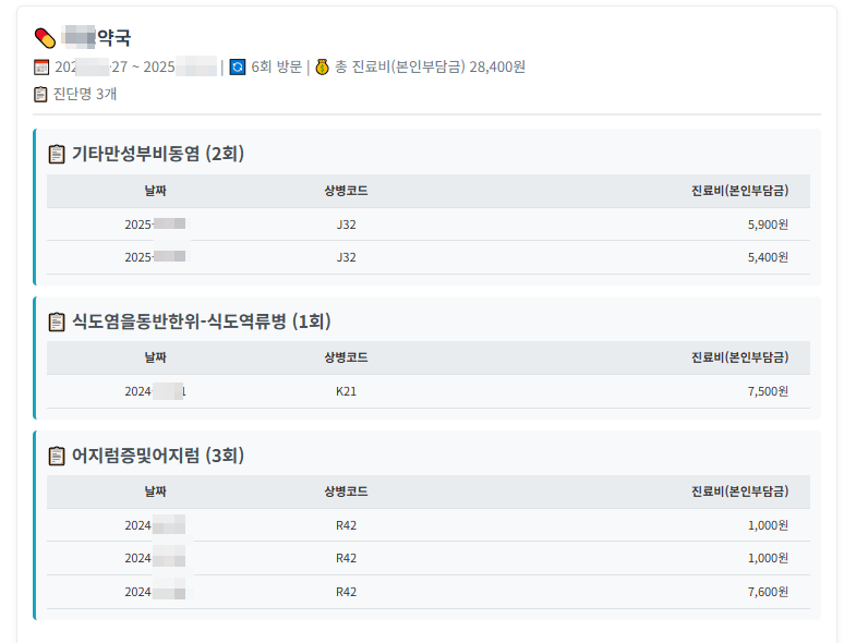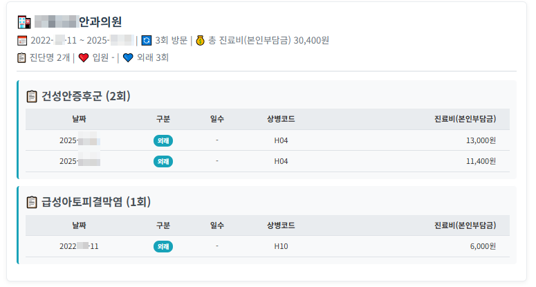 - 진단별 상세 내역 (날짜, 상병코드, 진료비)