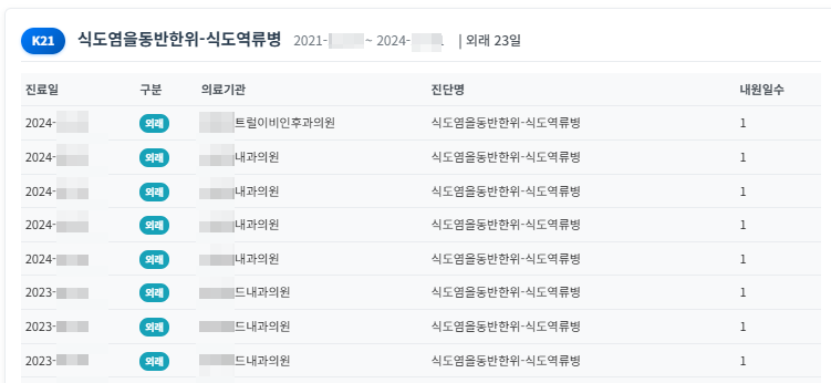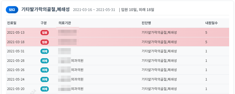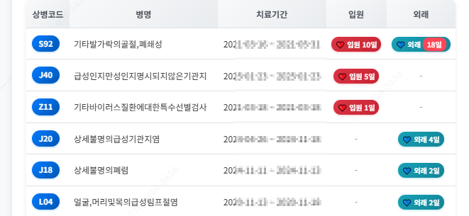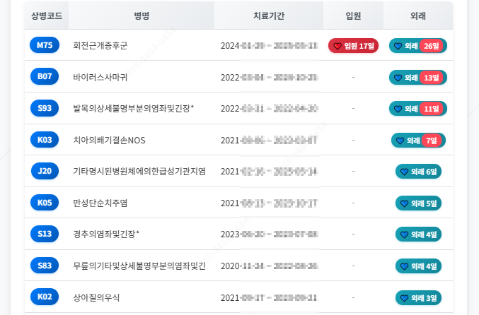 - 진단별 상세 내역 (날짜, 구분, 일수, 상병코드, 진료비)